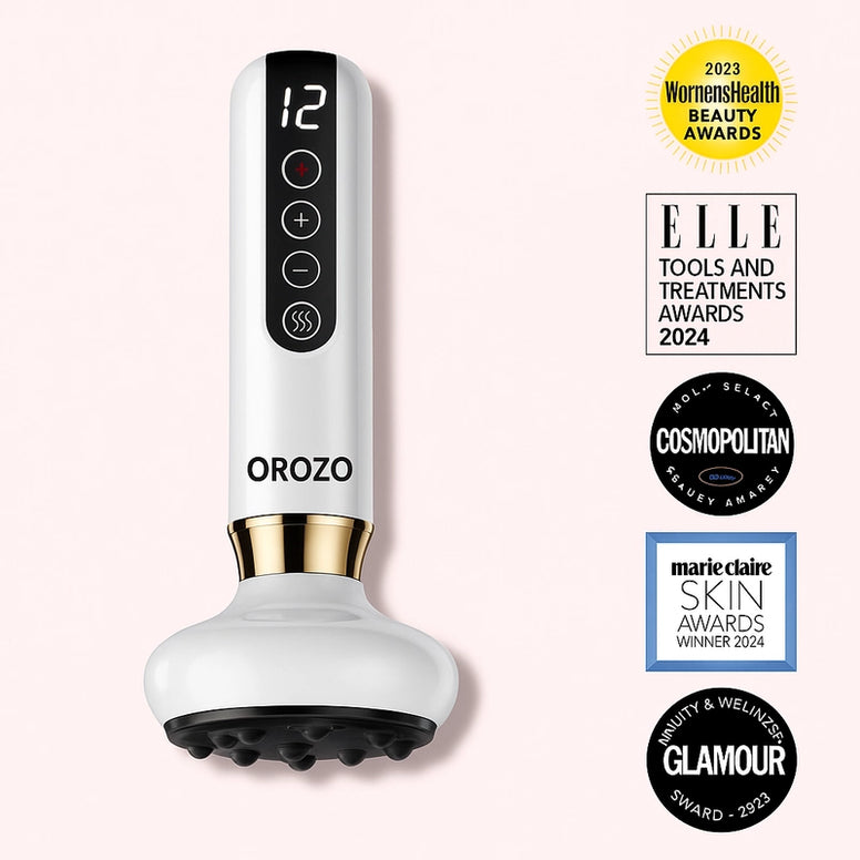 Le masseur Orozo combine la thérapie par lumière rouge, la chaleur, l’aspiration par ventouse et le massage Gua Sha pour une action complète et en profondeur.